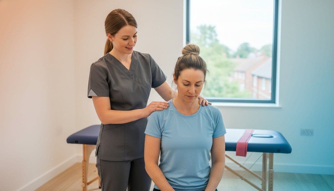 Many of our patients in Milton Keynes and Northampton spend over 8 hours a day at workstations. Poor ergonomics often exacerbate shoulder issues. Ensure your screen is at eye level to prevent "tech neck," which refers pain directly to the shoulder blade. Your elbows should rest at a 90-degree angle, supported by armrests to take the weight off your upper trapezius muscles. Every 30 minutes, perform a "Bruegger’s relief position": sit at the edge of your chair, spread your knees, turn your palms outward, and take three deep diaphragmatic breaths. This simple 20-second reset can reduce muscular fatigue by up to 40% over a working day.